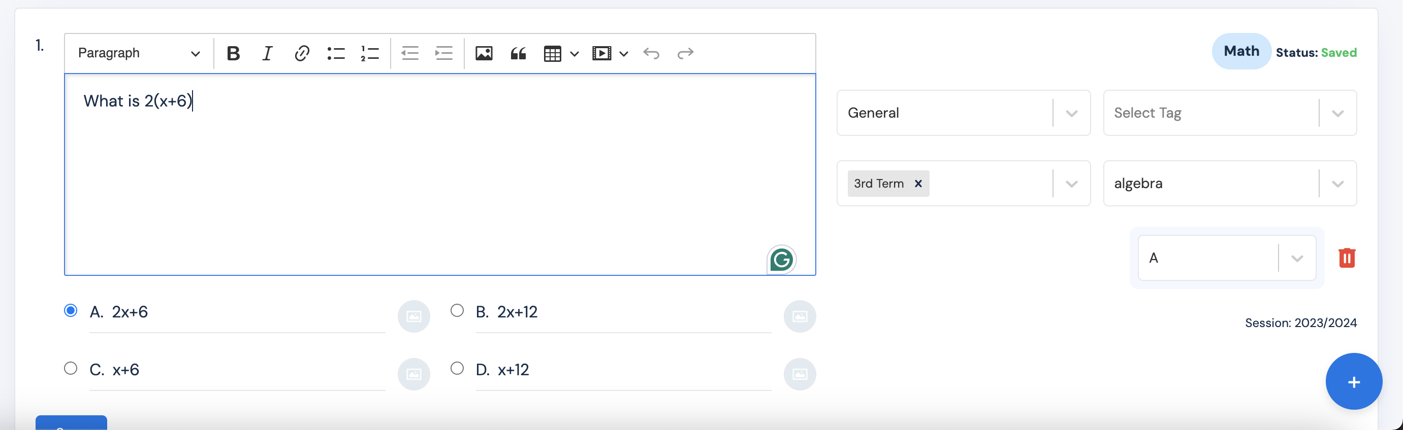 Go to your question bank and select the class and subject you wish to add maths symbol or equations to.
