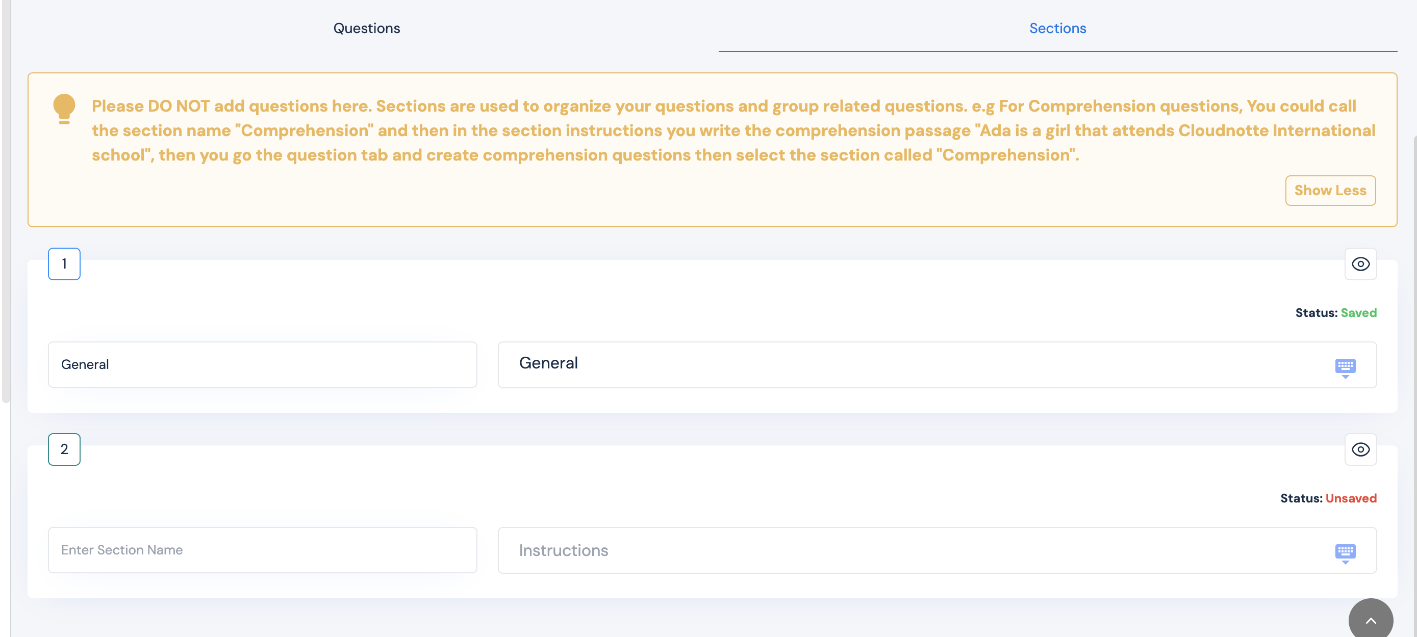 On the Enter Section Name input: This is where you enter the section title E.g Comprehension\