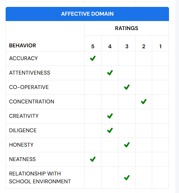 There are different Skills listed out in the Affective Domain in the Report Sheet.