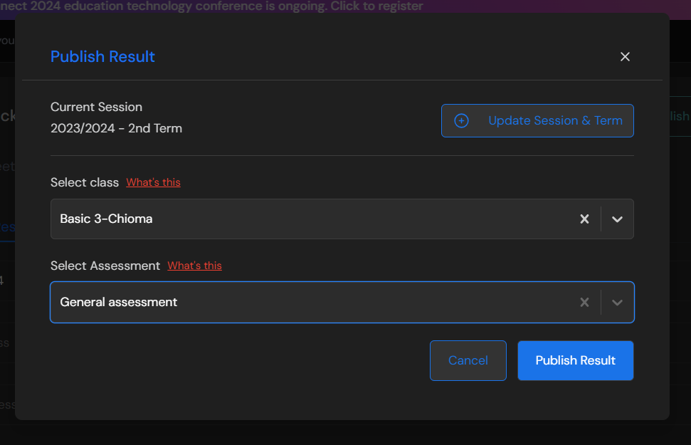 Once that is clicked, tis pops up on your screen select the class and assessment and click **Publish Result** at the bottom right.