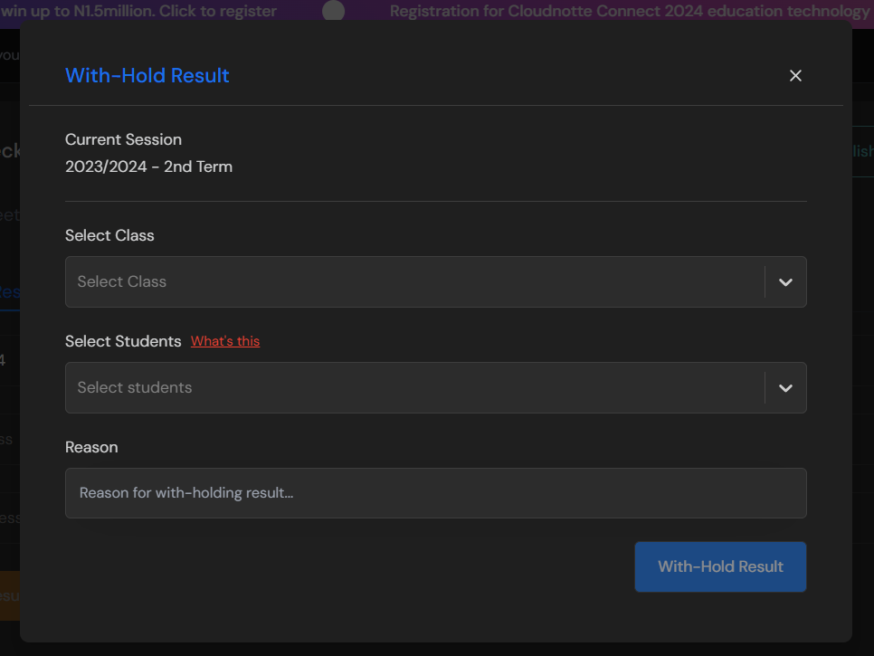 Withholding results in the report sheet module of Cloudnotte refers to the process of temporarily or permanently preventing a student's grades and performance reports from being visible to authorized stakeholders i.e students, parents, teachers.