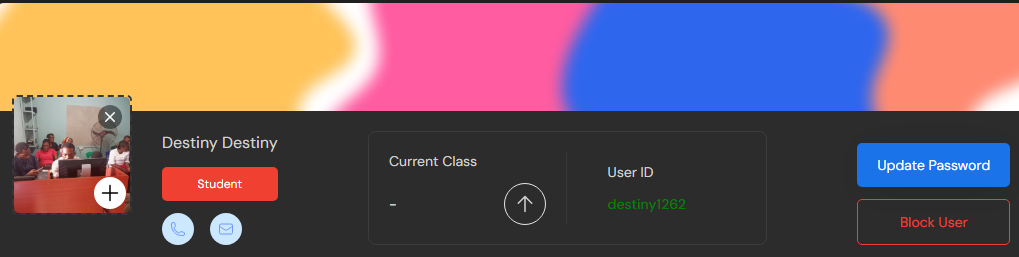 <figure><img src="https://3775903134-files.gitbook.io/~/files/v0/b/gitbook-x-prod.appspot.com/o/spaces%2F-M5g0GGFpfhvySUx2WRT%2Fuploads%2FyrxagLggHi9HtR09Xh9j%2FScreenshot%202024-05-01%20145622.png?alt=media&#x26;token=86363086-652d-40fc-b70e-02c2acc7c79e" alt=""><figcaption><p>When you click on the student's profile, you"ll see update password at the right corner of your screen.</p></figcaption></figure>